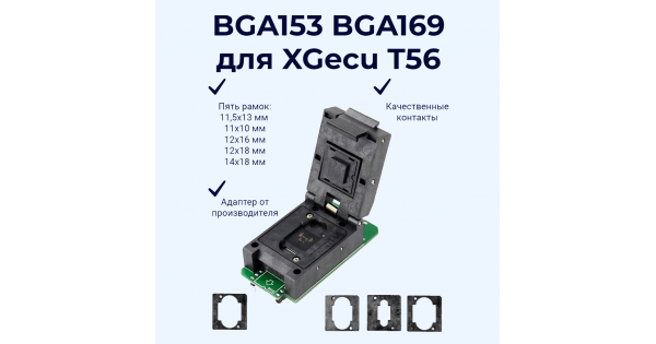 Адаптер BGA153 BGA169 для XGecu T56Комплектация:Одна плата адаптера BGA153/169 с разъемомПять рамок:..